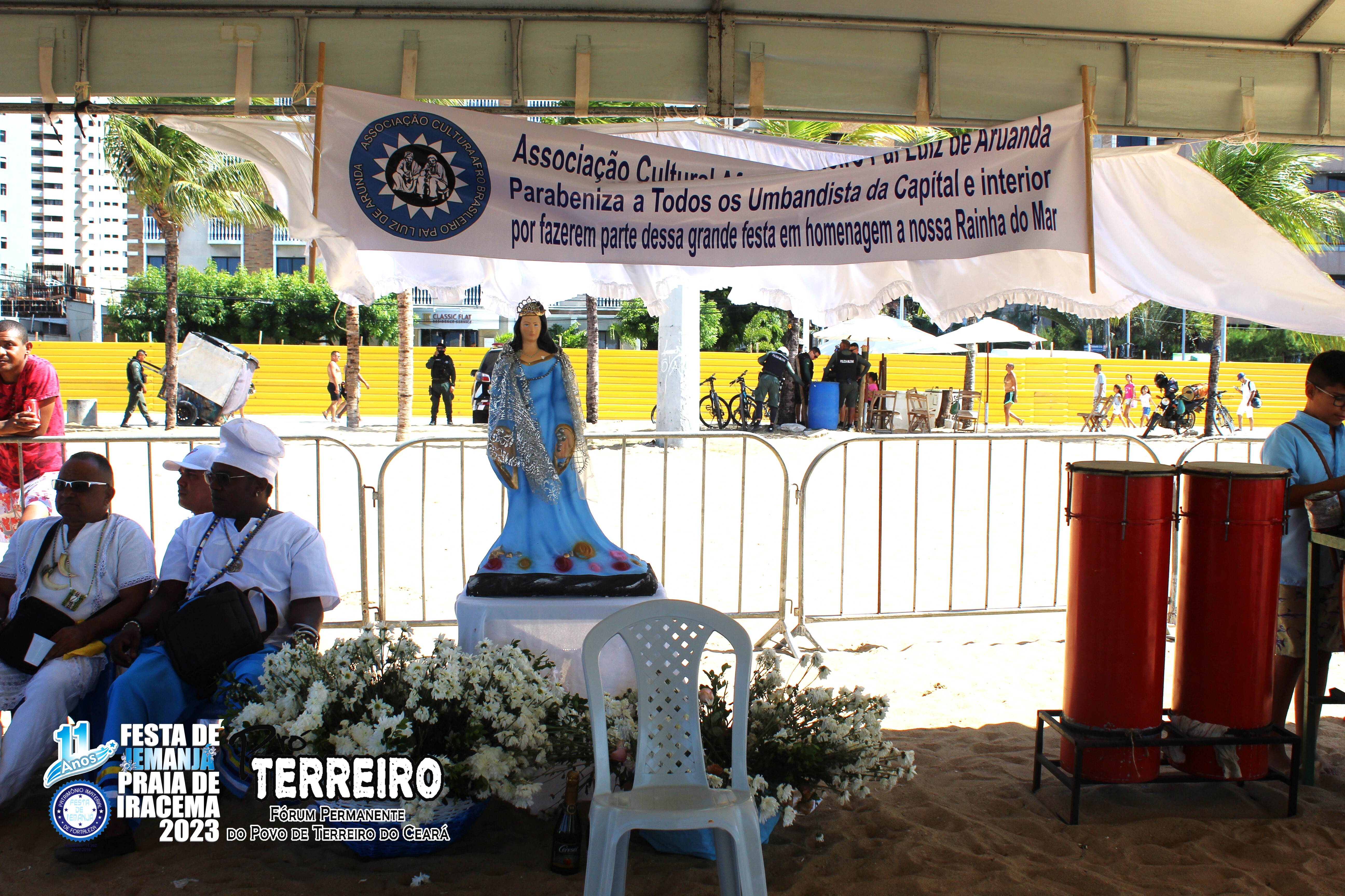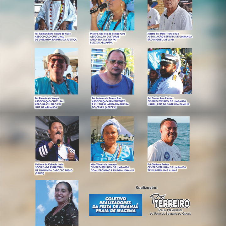 A Festa de Iemanjá na Praia de Iracema, em Fortaleza, tornou-se um evento emblemático a partir de 2013, marcando não apenas uma celebração religiosa, mas também um ponto de convergência para a diversidade cultural e espiritual do Ceará. O diferencial desta festividade reside na união dos terreiros, que se uniram com o propósito comum de promover e preservar as tradições afro-brasileiras, além de fortalecer os laços comunitários.Desde o início, a participação ativa dos terreiros foi crucial para o sucesso e a expansão da festa ao longo dos anos. A colaboração entre o Centro Espírita de Umbanda São Miguel, a Associação Cultural Afrobrasileiro Pai Luiz de Aruanda e a Associação Cultural de Umbanda Rainha da Justiça, liderados pelos respeitados líderes Pai Neto Tranca Rua, Pai Ricardo de Xangô, Mãe Bia de Pombagira e Pai Raimundinho Dente de Ouro, respectivamente, proporcionou uma sinergia única, enriquecendo a celebração com diferentes perspectivas espirituais e culturais, tornando o coletivo de REALIZADORES DA FESTA DE IEMANJÁ DE FORTALEZA - PRAIA DE IRACEMA.