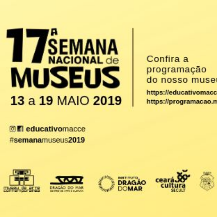 De 13 a 19 de maio acontece a 17ª Semana Nacional de Museus – SNM, temporada cultural promovida pelo Ibram em comemoração ao Dia Internacional de Museus (18 de maio). Nessa edição, 1.114 instituições de cultura de todo o país oferecem ao público 3.222 atividades especiais, como visitas mediadas, palestras, oficinas, exibição de filmes e muito mais!Como de costume, o Museu de Arte Contemporanea do Ceará - MAC.CE através do Setor Educativo promove a programação da semana no Dragão do Mar.