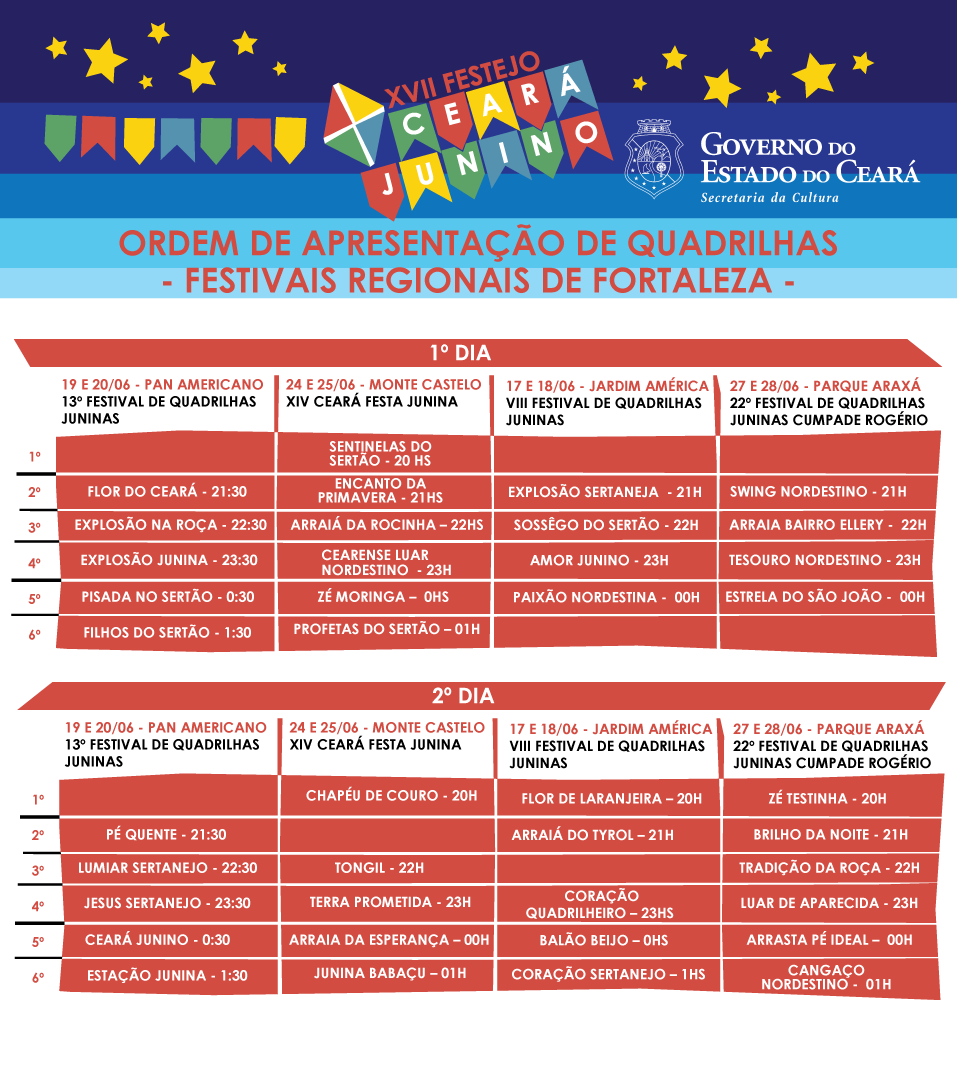 O XVII EDITAL CEARÁ JUNINO – 2015 tem por objetivo a seleção pública de projetos relacionados às tradições regionais voltadas para os festejos juninos, nas seguintes categorias: