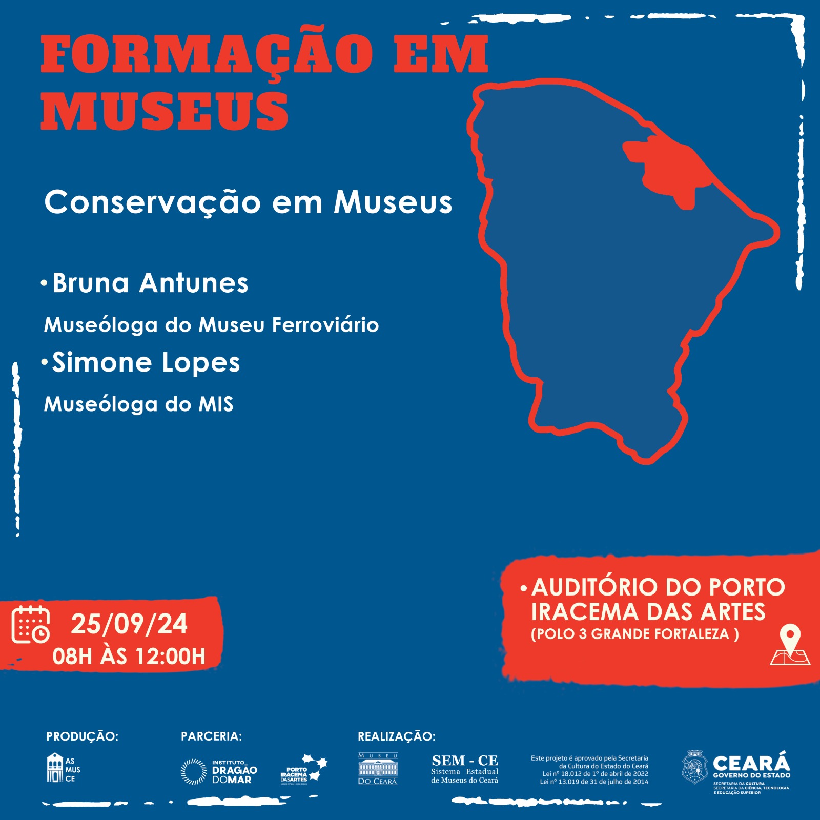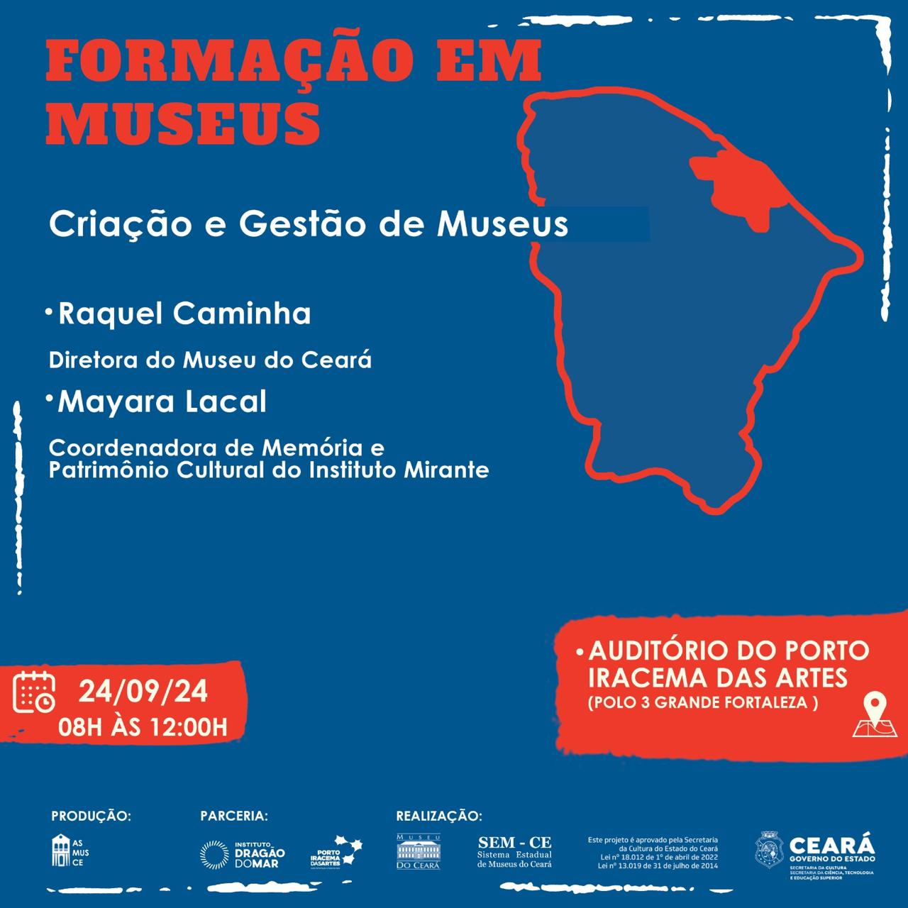 A “Formação em Museus”, é uma realização do Governo do Ceará, por meio da Secretaria da Cultura (Secult Ceará) e do Sistema Estadual de Museus (SEM/CE), em parceria com a Associação dos Amigos do Museu do Ceará (ASMUSCE).